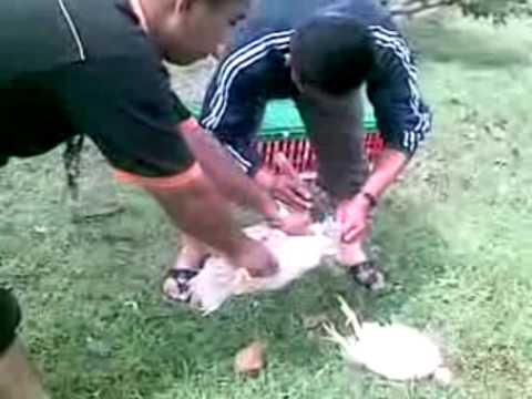 Menghilangkan nyawa binatang yang halal dimakan dengan memutuskan urat halkum dan merikh